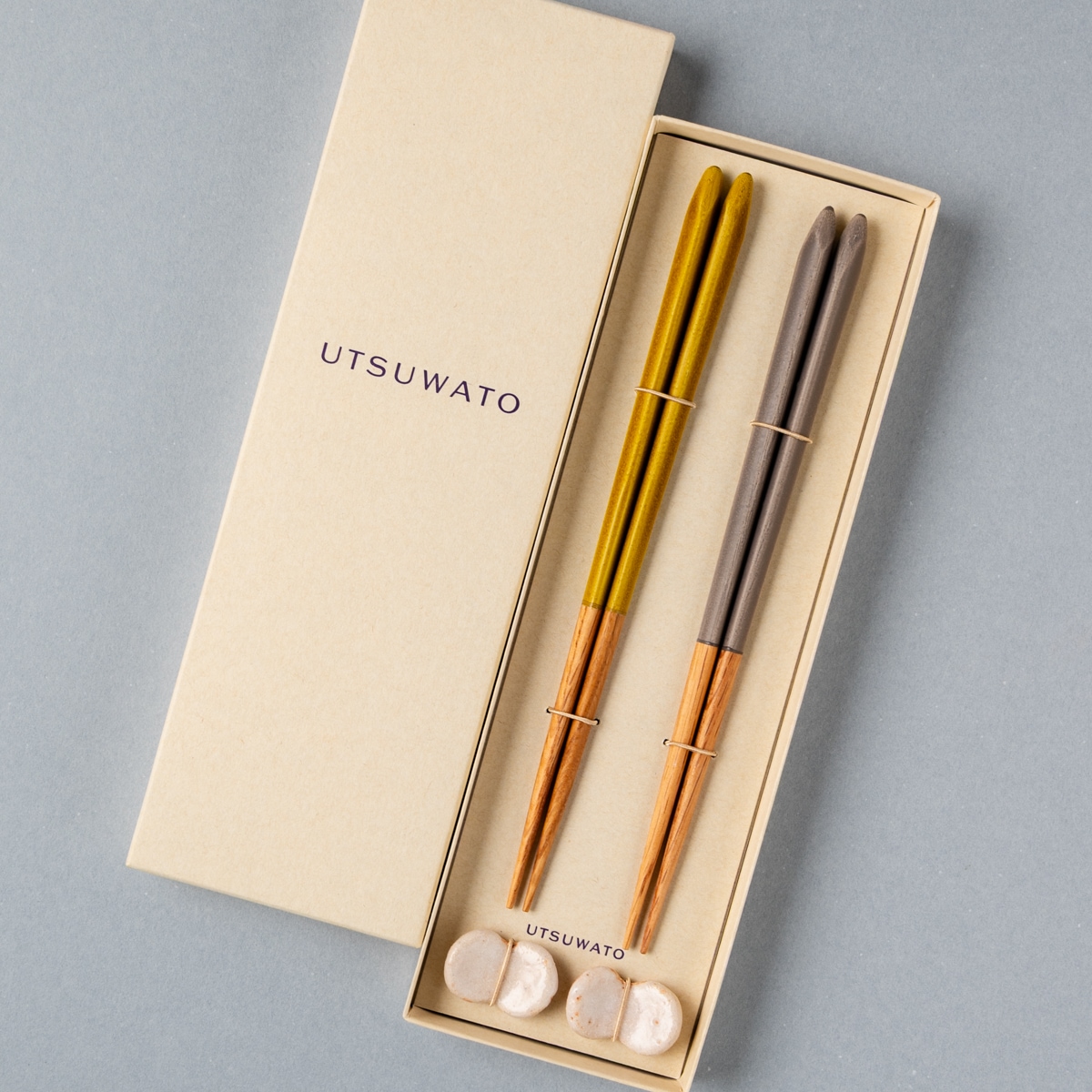 UTSUWATOの箸と志野焼の箸置をセットにし、やわらかなベージュトーンの箱におさめました。