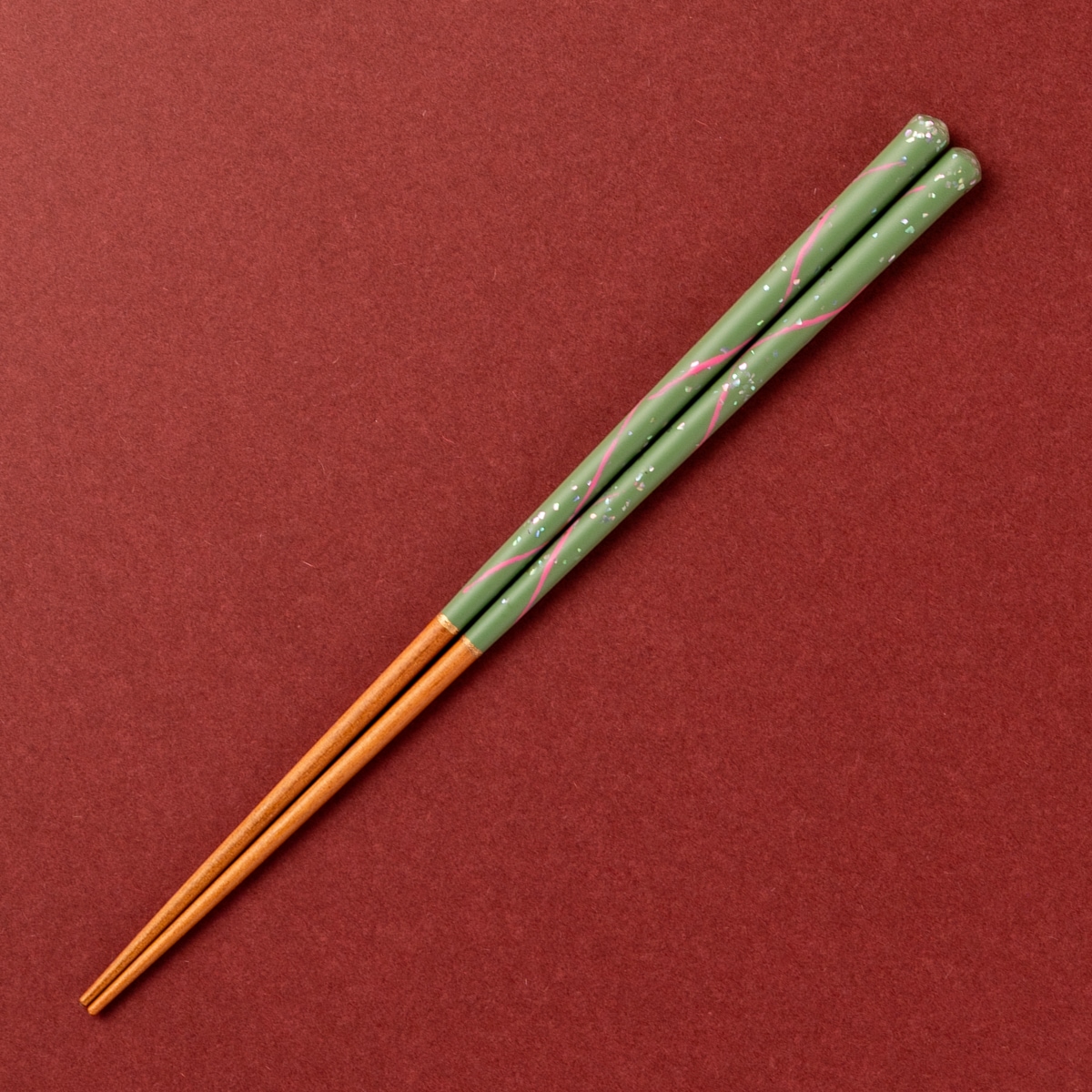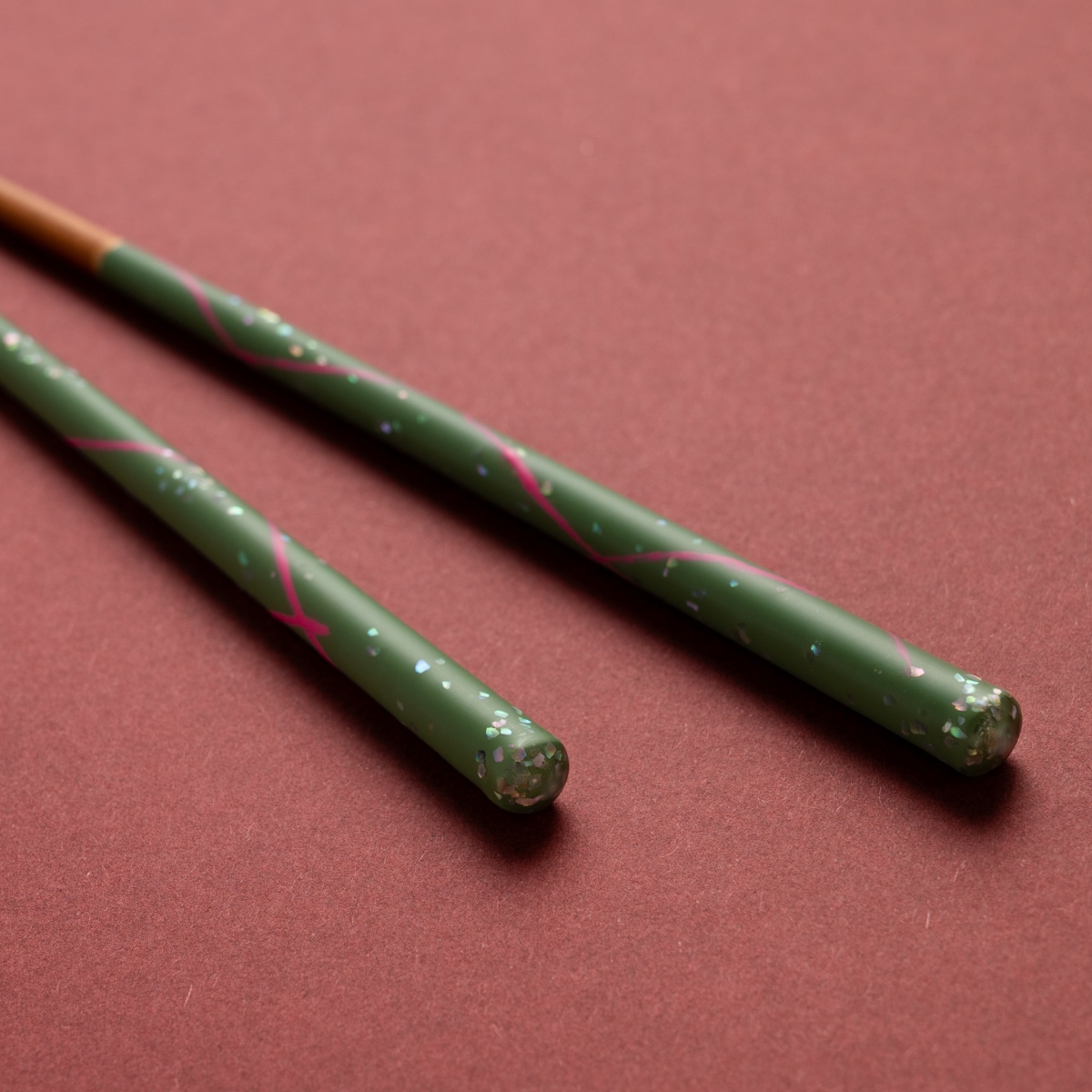 箸頭からこぼれ落ちるように貝片をふんだんに散りばめ、光を受けてシルバーやピンク、ブルーに美しく輝きます。