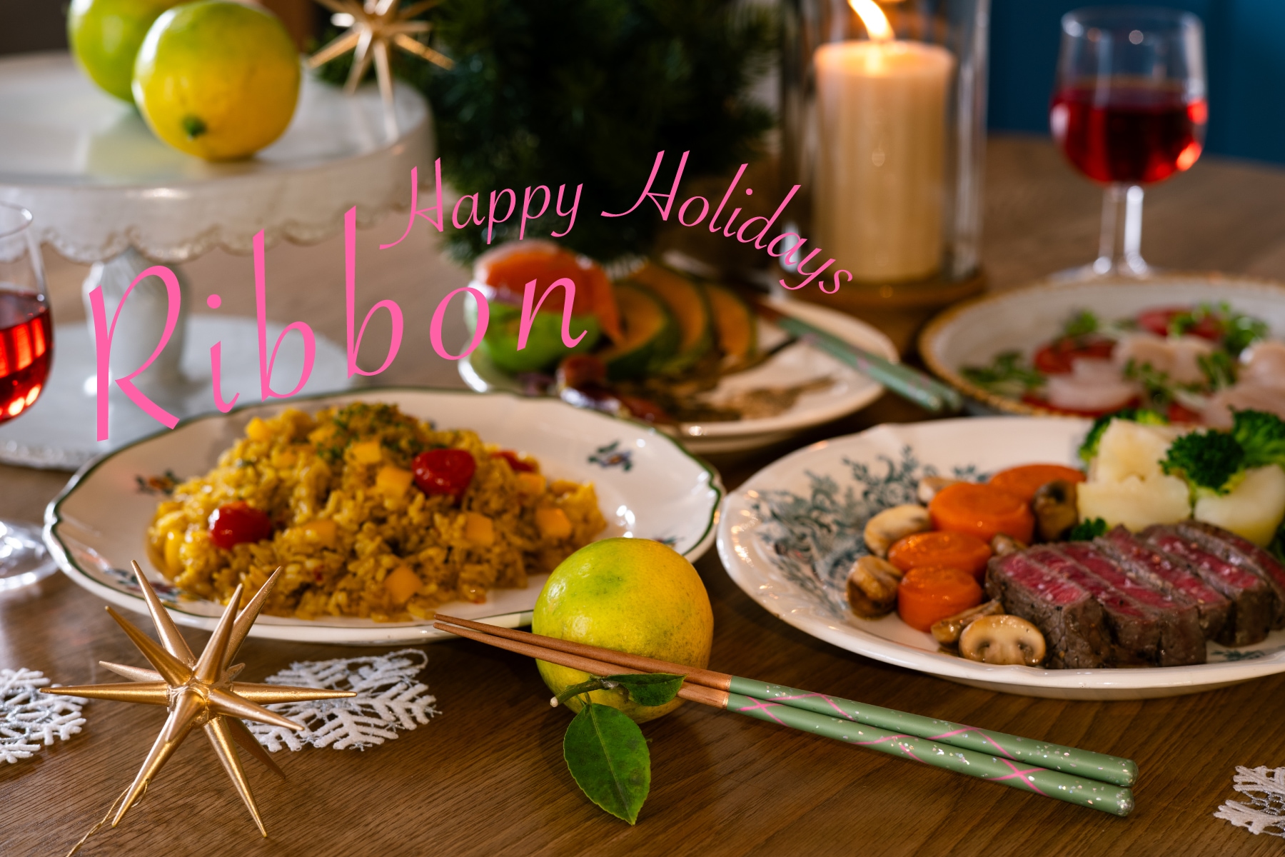 Happy Holidays Ribbonは、雪の降る中、手の中でクリスマスツリーにRibbonを可愛いく結んでいくイメージでつくりました。