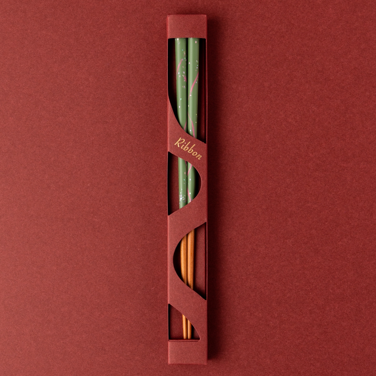 このスペシャルなRibbon箸のために、流れるリボンをモチーフにした特製ボックスを作っていただきました。女性らしさを感じさせる大人っぽいバーガンディ色で、アクセサリーが入っているような、心躍るデザイン!